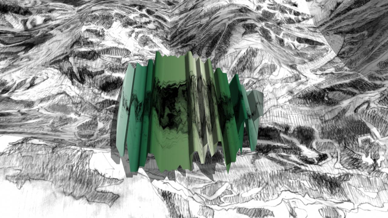 When the performance begins, the viewer-listeners are in a world of hand-drawn landscapes, modeled into 3-D. All of the landscapes are black and white with a black sky. As the music plays a three-dimensional colored and image-embedded geometric structure takes shape in the space over the landscape; constructed from two-dimensional pictures of the landscape images representing the instrument families that are linked metonymically. These colored polygons each have a particular, transparent hue; I based the color on a timbre analysis of which instrument is sounding and what the particular playing technique is at that moment. The saturation of the color reflects changing dynamics (loud, soft, and the steps between them). These flat strips of landscape images appear up and down in a vertical space, determined by their pitch values. A higher pitch exists in a higher place than a low pitch. The pitch analogy corresponds to a vertical scale. The volume (in the attack) of the sound controls the width of the image embedded polygons. After the music has played there remains a complete sculpture that we can explore further interactively. The viewer can move at will through space and touch elements of the sculpture to hear the sound that initially produced it.